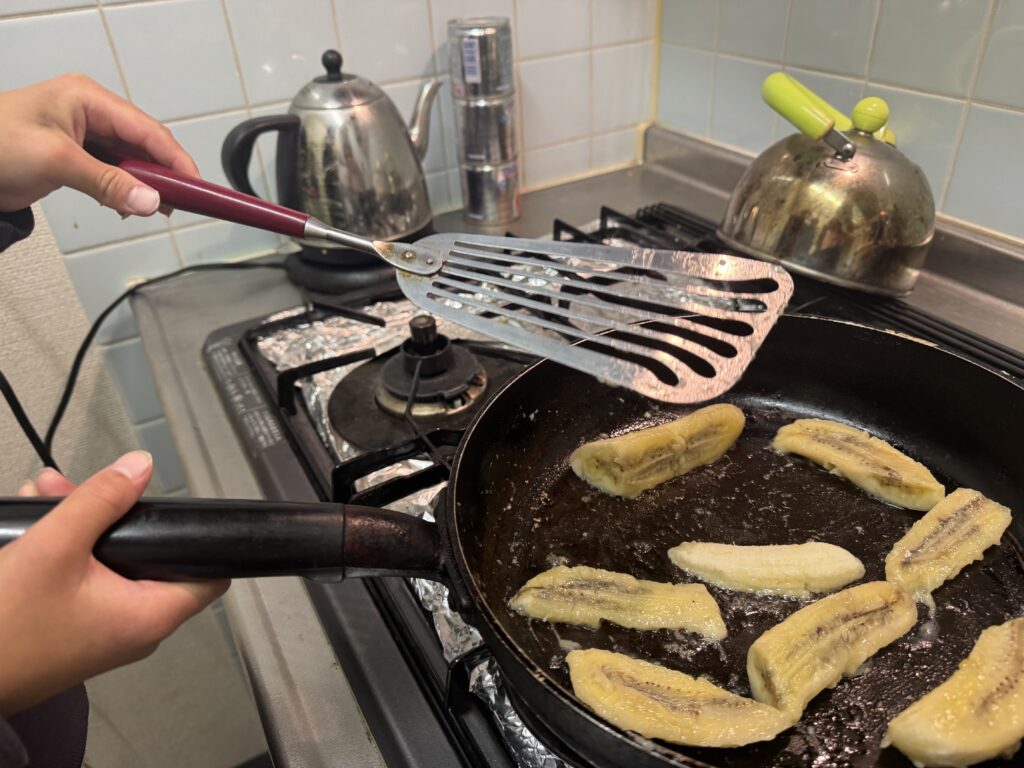 のびーく内の「バナナカフェ」(他の子がイベントで実施)の看板を見て、ジブンもやりたくなったようです。さっそく、「よしやろう!」と講師S。準備をして、バナナソテーをつくりました。